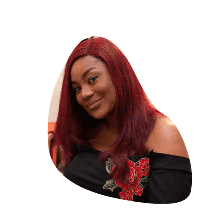 A beautiful woman with long red hair smiles warmly, wearing a black off-the-shoulder top with red floral details, from the Little Black Book series.
