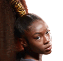 A beautiful woman with a stylish ponytail smiles and then laughs, expressing happiness and delight.