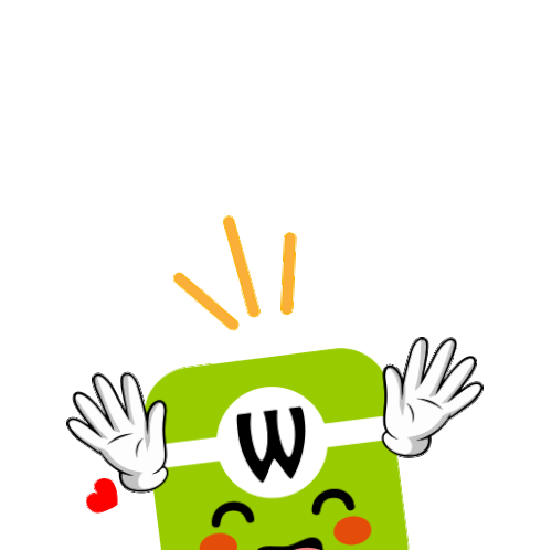 A cheerful green character with a 'W' on its chest raises its hands and exclaims "YEAYY!!" with hearts.