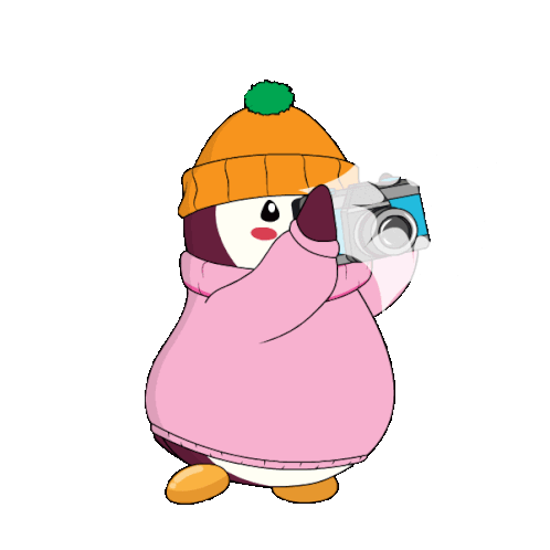 A cute cartoon penguin in a pink sweater and orange hat holds a camera, ready to take a picture with a sweet smile.