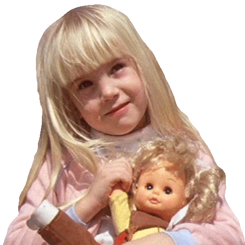 Carol Anne Freeling, portrayed by Heather O'Rourke, smiles sweetly while holding her doll.