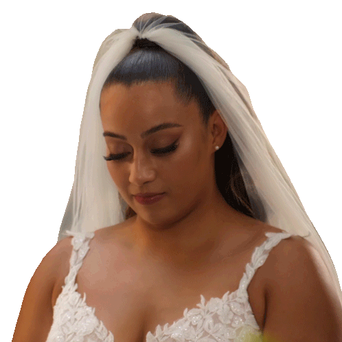 Demi Santana Brown, wearing a beautiful wedding dress and veil, looks down and then smiles gently.