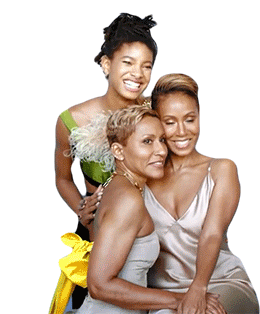 Jada Pinkett Smith, Willow Smith, and Adrienne Banfield Norris pose together, smiling brightly for a family portrait.