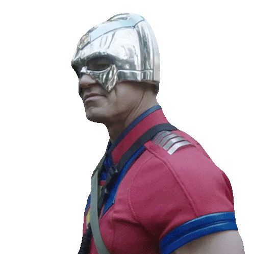 a man wearing a red shirt and a silver helmet looks at the camera