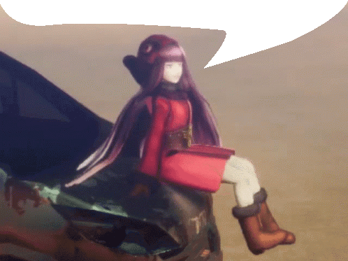 a girl with long purple hair is sitting on a car with a speech bubble above her head