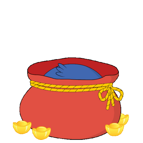 A cute Pudgy Penguin peeks mischievously from a red lucky bag, surrounded by golden ingots, embodying secrecy and good fortune.