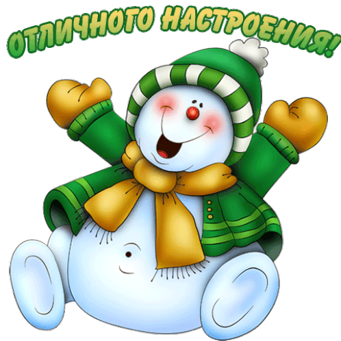 a snowman wearing a green and white striped hat and scarf with the words " отличного настроения " below him