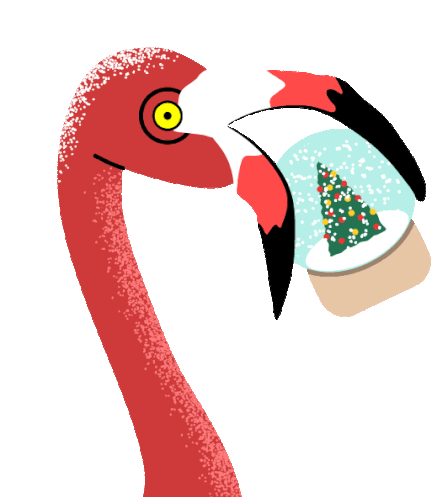 A charming flamingo, created by Giacomo Cerri, holding a miniature snow globe featuring a Christmas tree, ideal for holiday greetings.