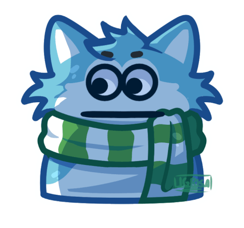 A blue, furry, husky-like cartoon character named Snowball wears a green and white striped scarf with a slightly angy expression.