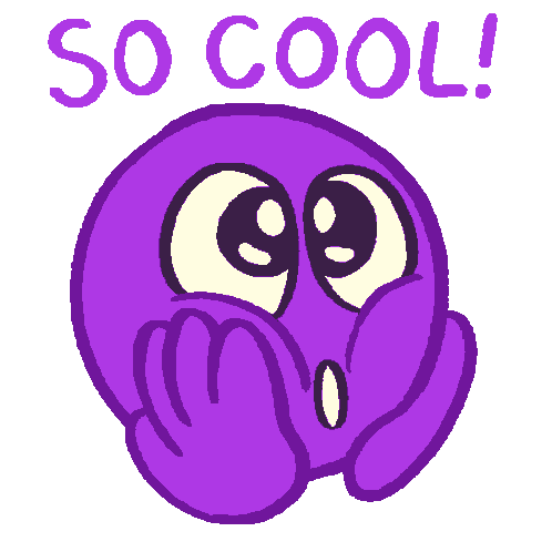 A vibrant purple emoji character with big eyes and a surprised expression, exclaiming 'SO COOL!' with enthusiasm.