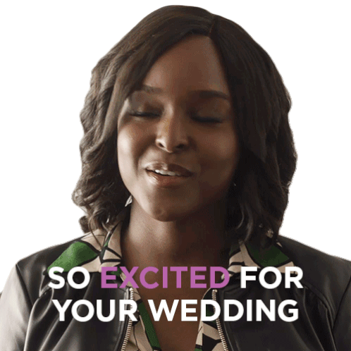 Antoinette Robertson as Vivian expresses excitement for a wedding, smiling and looking happy.