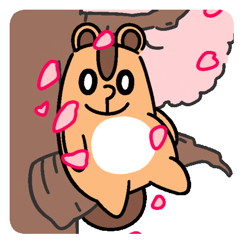 A cute, happy hamster-like creature smiles amidst falling pink cherry blossom petals, radiating pure joy.