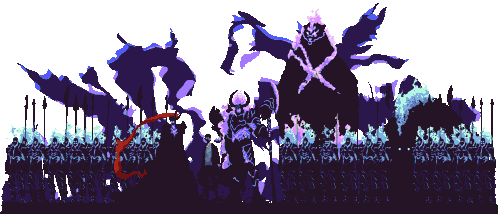 A pixel art sticker inspired by Solo Leveling, depicting a powerful knight, a colossal monster, and an army in a dark fantasy setting.