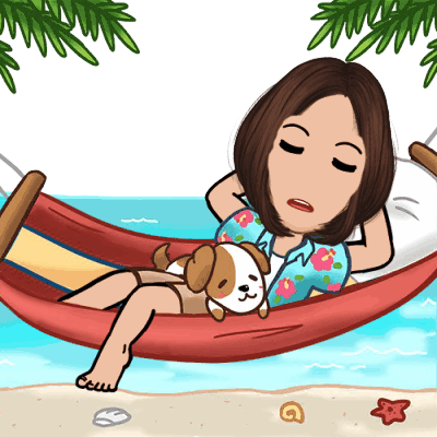A cartoon woman and her dog peacefully sleep in a red hammock on a sunny beach, surrounded by palm trees and a dolphin in the sea.