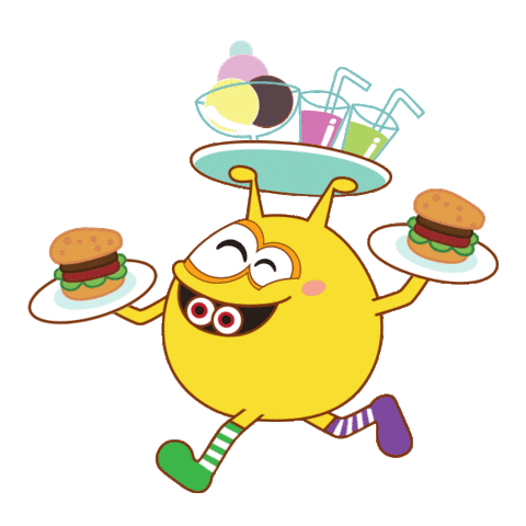 A cheerful cartoon character holds a tray with refreshing sorbet desserts, drinks, and fast food items like hamburgers.