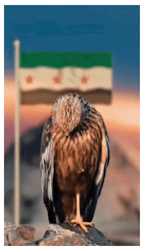 a bird sitting on a rock with a flag in the background