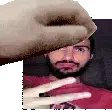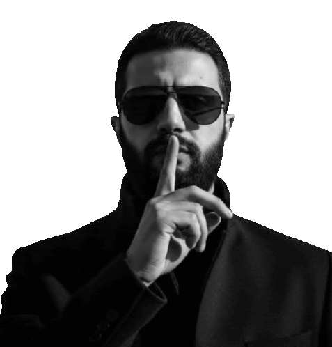 a man with a beard wearing sunglasses holds his finger to his mouth