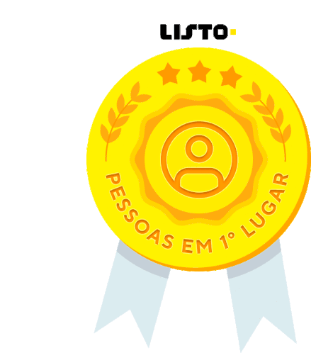 A vibrant gold medal with the text "LISTO" and "PESSOAS EM 1° LUGAR" (People in 1st Place), symbolizing achievement.
