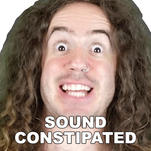 a man with long curly hair is smiling with the words sound constipated written on his face
