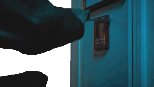 A person's hand reaches out to pull the lever on a red fire alarm box, activating the emergency signal.
