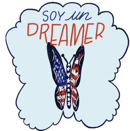 Animated sticker featuring a butterfly with US flag wings and the text 'Soy Un Dreamer' in a cloud shape.