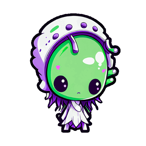 A cute, chibi-style green alien character with large eyes and a unique headpiece, perfect for adding a cosmic touch.