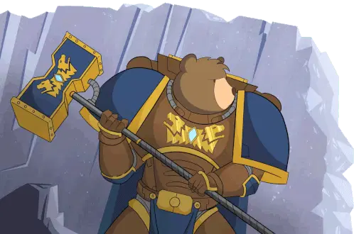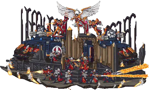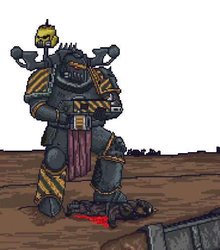 A pixel art Warhammer 40k Space Marine in dark power armor, with glowing red eyes and a skull helmet, aiming a bolter.
