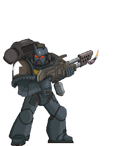 A pixel art Space Marine from Warhammer 40k fires a powerful flamethrower, emitting bright orange flames.