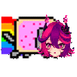 Specklini Specks, an envtuber, is depicted as a pixel art character riding a Nyan Cat with a rainbow trail.