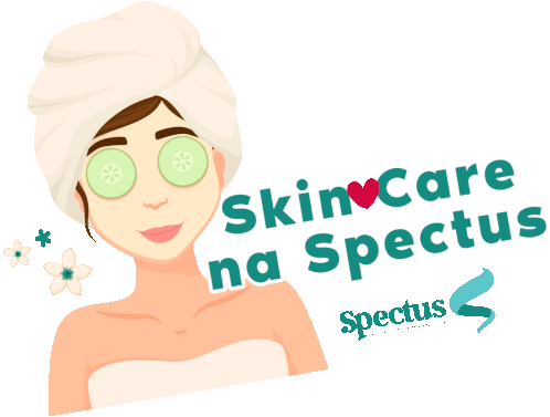 An illustration for Spectus Cg Estratégia De Comunicação, featuring a woman enjoying a "Skin Care na Spectus" moment.