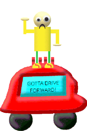 A yellow robot stands on a red car displaying 'GOTTA DRIVE FORWARD!' on its screen, ready for a speedy journey.