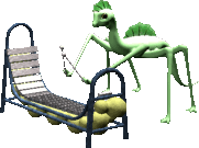 Finfin Spidasaures, the green dinosaur-like creature, stands beside a bed in this retro sticker.