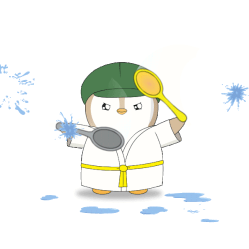 A cute Pudgy Penguin character in a robe and cap, skillfully deflecting blue splatters with two spoons.