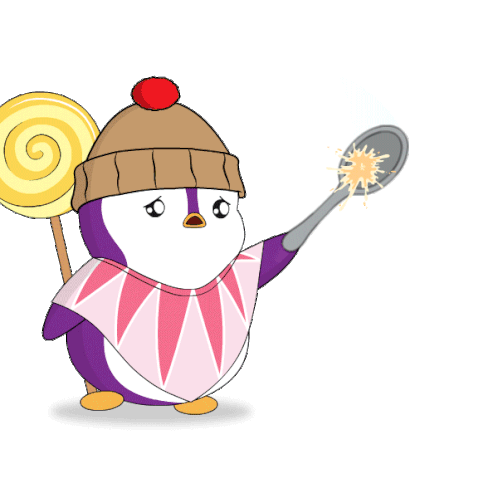 A Pudgy Penguin character, holding a lollipop, uses a spoon to comically deflect attacking bees.