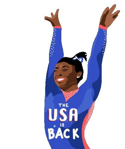 Simone Biles celebrates in her USA gymnastics leotard, proclaiming 'The USA is Back' with arms raised.