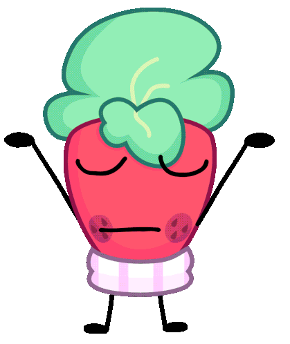 a cartoon drawing of a strawberry with arms and legs and a green hairdo