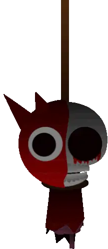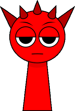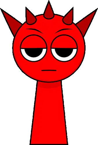 A red cartoon character, Sprunki Raddy, with spiky horns and a bored expression, stands upright.