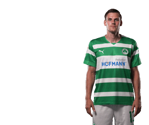 Max Christiansen, a player for SpVgg Greuther Fürth, gives a cheerful double thumbs-up gesture, showing approval.