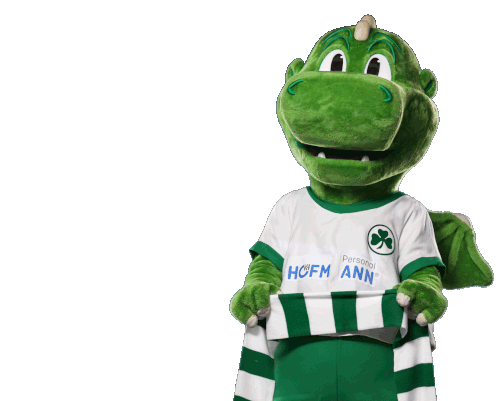 SpVgg Greuther Fürth mascot Eddy, a green dragon, proudly displays a green and white striped scarf.