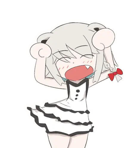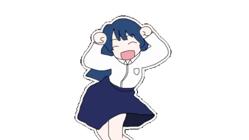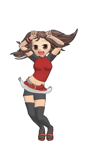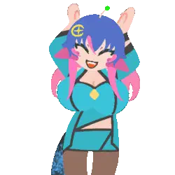 Squeex joyfully performs the Caramelldansen dance, wearing headphones and smiling with hands up.