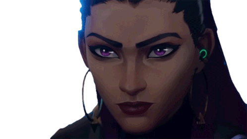 Reyna from Valorant squints her eyes, looking intently with a serious expression. Perfect for showing suspicion or close examination.