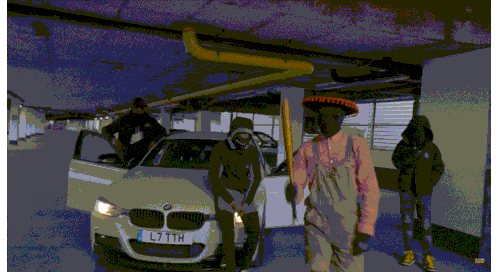 Sr Poundz and his crew are seen with a white BMW in an underground parking garage, creating a street scene.