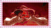 a couple of people standing next to each other in a dark room with a red background .