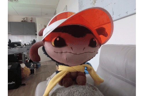 Animated sticker of a cute plush toy of Kay Vess and Nix from Star Wars Outlaws, wearing a hat and scarf.