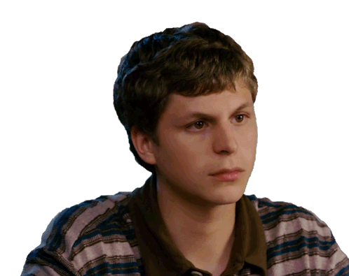 Michael Cera, known for Superbad, stares intently with a serious and focused expression, wearing a striped shirt.