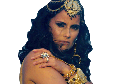 Nelly Furtado with an intense stare, adorned in an elaborate gold headpiece and dramatic makeup.