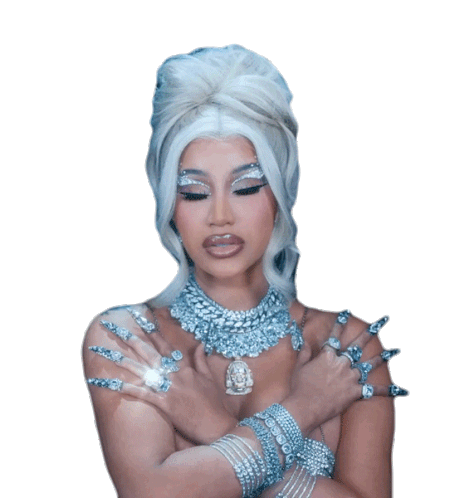 Cardi B confidently stares at the camera, showcasing her elaborate silver jewelry, including a large necklace and rings.