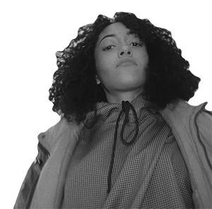 Jenevieve stares down with a sassy expression, her curly hair framing her face as she looks directly at the viewer.