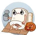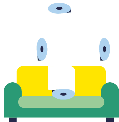 Animated sticker showing toilet paper rolls falling onto a sofa, symbolizing staying home and comfort.