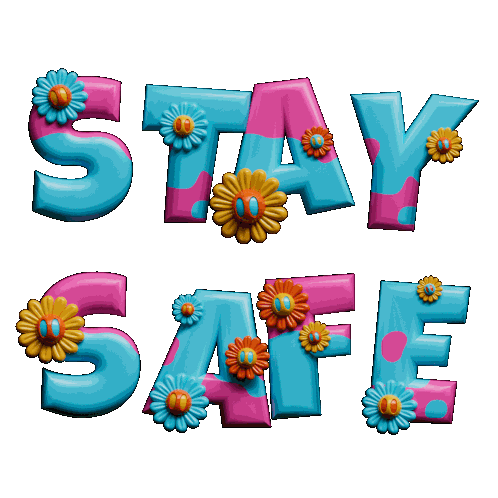 A vibrant 3D sticker featuring the message 'STAY SAFE' in blue and pink letters, adorned with cheerful yellow and orange flowers.